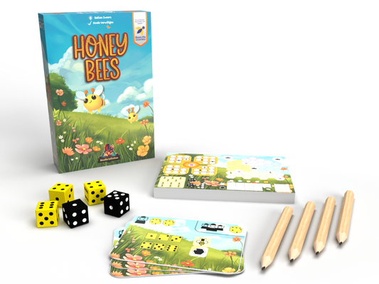 In Honey Bees, it's all about scoring the most points by pollinating flowers, building your hive, and filling it with honey. It's an exciting game where every roll of the dice can bring you closer to victory!