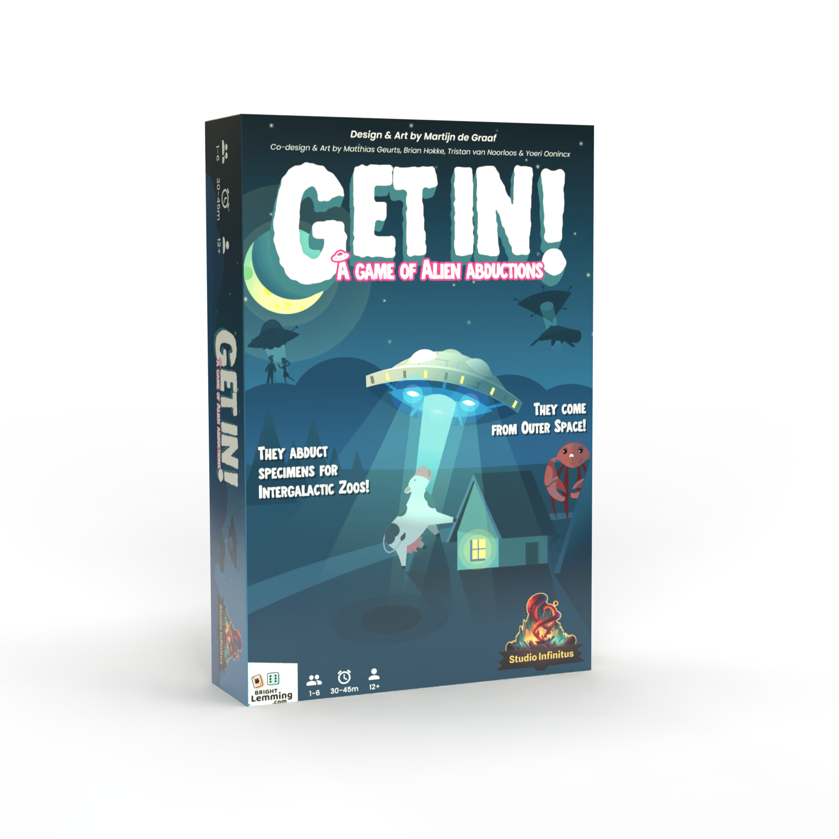 Get In! is een luchtig en vlot bordspel met dobbelstenen van Studio Infinitus. In dit humoristische gezelschapsspel kruipen spelers in de rol van aliens die met hun UFO’s mensen, dieren en alledaagse voorwerpen ontvoeren.